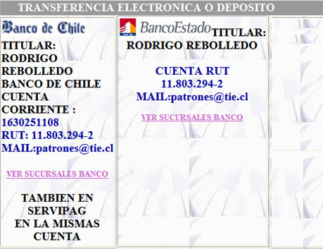 | ENVIO A REGIONES VIA STARKEN (OFICINAS DE EMPRESA) ESTIMADO CLIENTE DESPACHAMOS A TODO CHILE .ANOTE LOS CODIGOS QUE APARECEN BAJO CADA FOTO EN INTERNET Y SOLICITELOS AL FONO : 226873536 O POR MAIL A patrones@tie.cl , EL PAGO LO PUEDE HACER MEDIANTE UNA TRANSFERENCIA , DEPOSITO O WEBPAY |