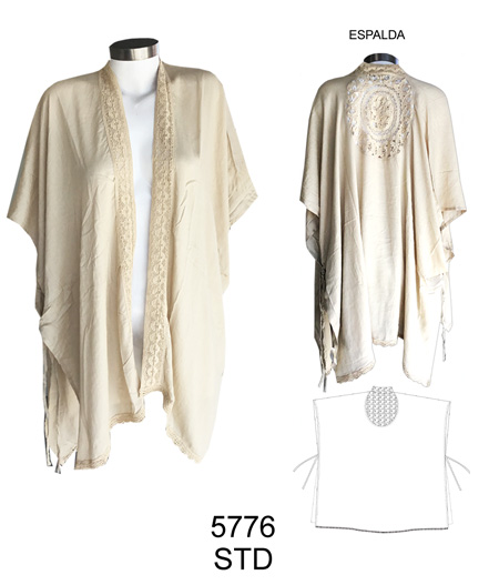TAPADO ESTILO KIMONO RUEDO ASIMETRICO, VISCOSA CON MACRAME Y CINTA DE ENCAJE